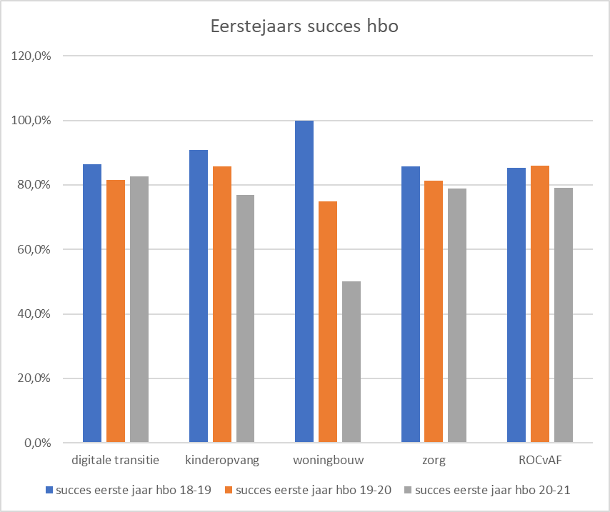 Effectindicatoren: 1. Succes in eerste jaar mbo (startersresultaat) ligt minstens op de norm. 2. Succes in eerste jaar hbo van studenten die doorstromen vanuit het mbo: Onze voormalige mbo-studenten in de maatschappelijke tekortsectoren blijft boven de 60% (uitgangsjaar is 20/21). De sector Woningbouw/Klimaat en energie is nu 50%. Deze sector blijft op minimaal 50%. (Juist in de Techniek wordt aan mbo-gediplomeerden banen aangeboden, wat stoppen met het hbo geen negatieve keuze maakt). De behaalde startersresultaten tonen vooruitgang in samenwerking tussen vo en mbo en doorlopende leerlijnen. Het succes in het eerst jaar hbo ligt voor de meeste sectoren rond de 80%. Alleen bij de sector Woningbouw wijkt ten negatieve dit af. Technische studenten hebben vaak goede arbeidsmarktkansen en kunnen met een mbo-diploma gemakkelijk een baan vinden met een redelijk salaris. dIn de toekomst, specifiek in 2026-2027, wordt onderzocht hoe de doorstroom tussen mavo, havo en mbo verder verbeterd kan worden, met concepten zoals de beroepshavo en On Board Almere. Resultaat 1: Het startersresultaat voor domeinen ICT, Techniek, Technologie & Mobiliteit en Zorg & Welzijn ligt alle schooljaren op of boven de norm ligt. Gemiddeld ligt het startersresultaat van het ROCvA-F op de norm in schooljaren 2018-2019 en 2021-2022 en boven de norm in schooljaren 2019-2020 en 2020-2021.