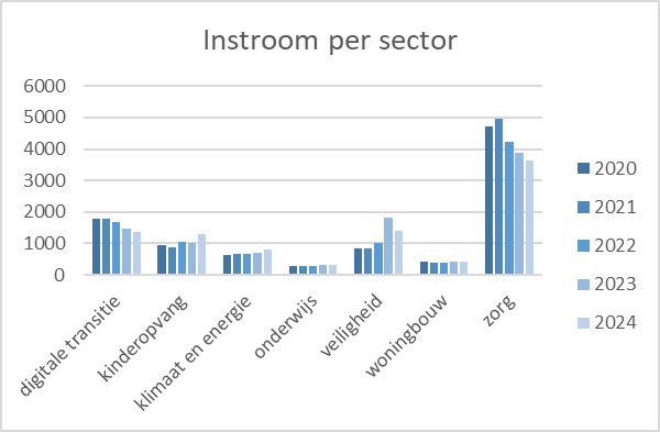 N.B. hier hebben we geen doelwaarden opgesteld, dit is een bewuste keuze. De instroom bij sommige van de benoemde maatschappelijke tekortsectoren hebben juist een groot aantal inschrijvingen, waarvan velen weer uitvallen. Het gaat dus vooral om goede voorlichting. Ook hebben we benoemd dat in onze regio alle sectoren maatschappelijke tekortsectoren zijn. De score op tevredenheid over de ondersteuning van de school bij de keuze voor verder leren of werken laat zien dat hier verbetering nodig is. Bij het diagram over de instroom zien we dat de instroom bij klimaat en energie, woningbouw en onderwijs vrij laag ligt. Het vervolg richt zich op het verder ontwikkelen van tools zoals Flexx, het creëren van een herkenbaar alumniplatform en het waarborgen van de interne en externe zichtbaarheid van het LLO-aanbod. Met deze initiatieven zet ROCvA-F zich in voor een betere instroom van studenten, ook in maatschappelijke tekortsectoren. De versterkte visie op LOB en effectieve oriëntatieprogramma’s helpen studenten om zich beter voor te bereiden op hun toekomstige loopbaan. Resultaat 1: Onze STO heeft vorig schooljaar voor het eerst gemeten in hoeverre studenten positief zijn over de hulp van school bij de keuze over verder leren of werken. Ons doel is dat dit percentage stijgt, vanaf komend jaar hebben we vergelijkingsmateriaal. De score op deze nieuwe vraag is: 35.9% is niet tevreden, 21.5% neutraal en 42.6% is tevreden of zeer tevreden. Met deze score zien we dat we op dit onderwerp moeten verbeteren. Resultaat 2: Bij de instroom in de maatschappelijke tekortsectoren zien we een wisselend beeld. De sectoren zorg en onderwijs laten een lichte daling zien ten opzichte van voorgaande jaren, terwijl de instroom in de sector digitale transitie stabiel blijft. Daarentegen is in de sectoren klimaat en energie en veiligheid sprake van een toename in het aantal instromende studenten. De instroom in de kinderopvang en woningbouw blijft relatief constant over de jaren heen.