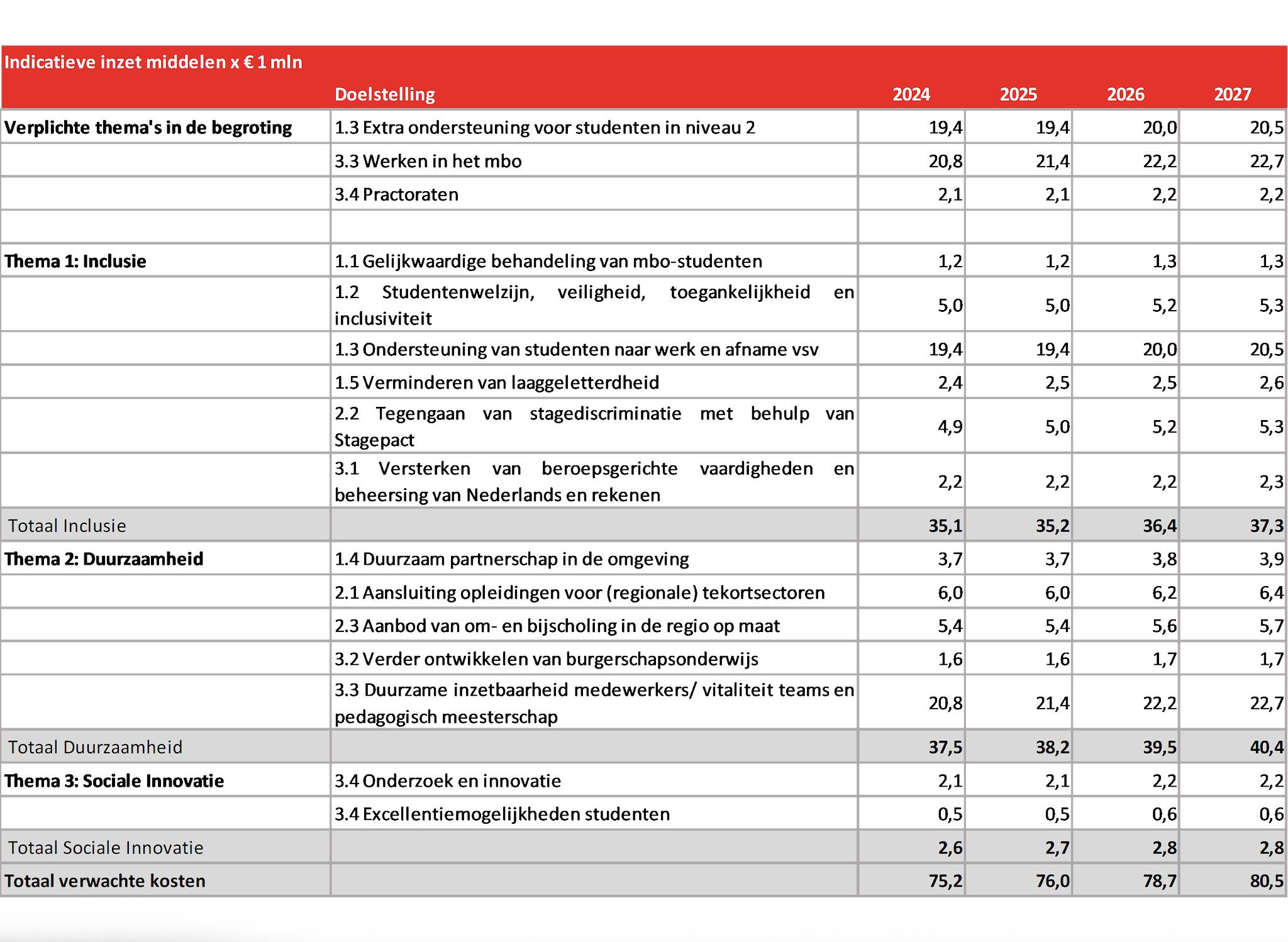 De indicatieve inzet van middelen in 2024 (€ 75,2 miljoen) is conform de oorspronkelijke begroting in de ingediende KA. De middelen in 2025 (€ 76,0 miljoen) zijn aangepast op basis van de financiële begroting en beschikkingen van de beschikbaar gestelde middelen. De jaren 2026 en 2027 ontwikkelen naar verwachting in lijn met de ontwikkeling van de studentenaantallen t-2. De lichte stijging van de studentenaantallen vergt naar verwachting een evenredige stijging van de inzet van middelen om de ambities in de komende jaren te realiseren.