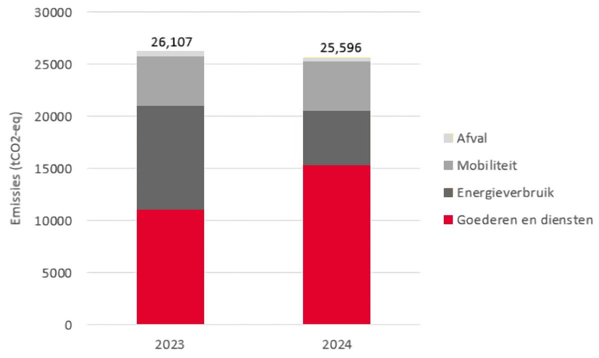 Onze gehele CO₂-uitstoot monitoren we sinds 2023 en bestaat uit directe uitstoot van gebouwen en vervoer, het gebruik van energie, en de impact van zaken als inkoop, reizen en afval.